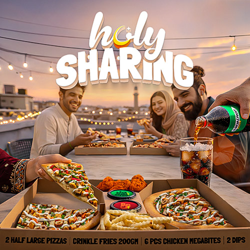 2 x Half Large Pizza, 6Pcs MegaBite, 200gm Crinkle Baked Fries, 2 x Dips, 1 x Large Drink
